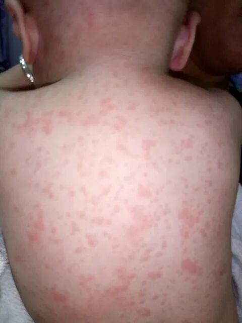 麻疹病症大多都是由急性呼吸道传染引发所致,其临床症状主要表现为流鼻涕、发热、咳嗽、流鼻涕等,主要人群为6个月~5岁幼儿。婴幼儿未能接种麻疹疫苗,就会容易患有该种皮疹病症。麻疹病症多发生在春冬交替季节,婴幼儿出疹之前仍以发热症状为主,待发热三四天之后就会出现麻疹症状,通常麻疹多从耳后开始,然后有面部颈部到达四肢,以充血性斑丘疹为主,待皮疹症状渐渐消退以后,会留下浅褐色的素斑,这些素斑持续一周以后恢复正常皮肤颜色。值得注意的是,由于麻疹病症具有较大的传染性,儿童在患有麻疹病症以后需要在家进行隔离,等出疹5天之后才能与其他小朋友进行接触。家长在患儿出疹期间, 除了为患儿服用退烧药物以外,还要让患儿大量饮水,多食用含有维生素A的食物。
