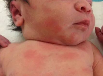 二、新生儿红斑常在生后1-2天内出现,原因不明,皮疹呈大小不等、边缘不清的斑丘疹,散布于头面部、躯干及四肢。婴儿无不适感。多在1-2天内迅速消失。