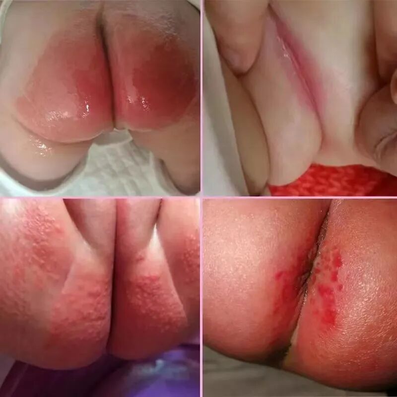 红臀发生在尿布包裹的部位,如臀部、会阴、阴囊、大腿内侧等处。轻症表现为皮肤血管充血,臀部皮肤发红粗糙,表面干燥。严重者会有明显的皮肤糜烂,有渗出液,还伴有红色丘疹、水泡,可发生皮肤出血、破溃,并可导致继发感染,引起败血症。